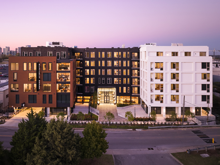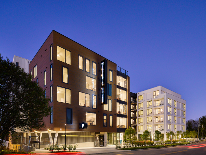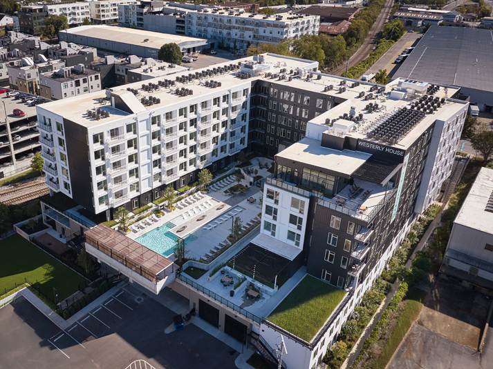 The new, eight-story building features 242 traditional and co-living apartments organized across six residential levels above a two-story podium parking structure.